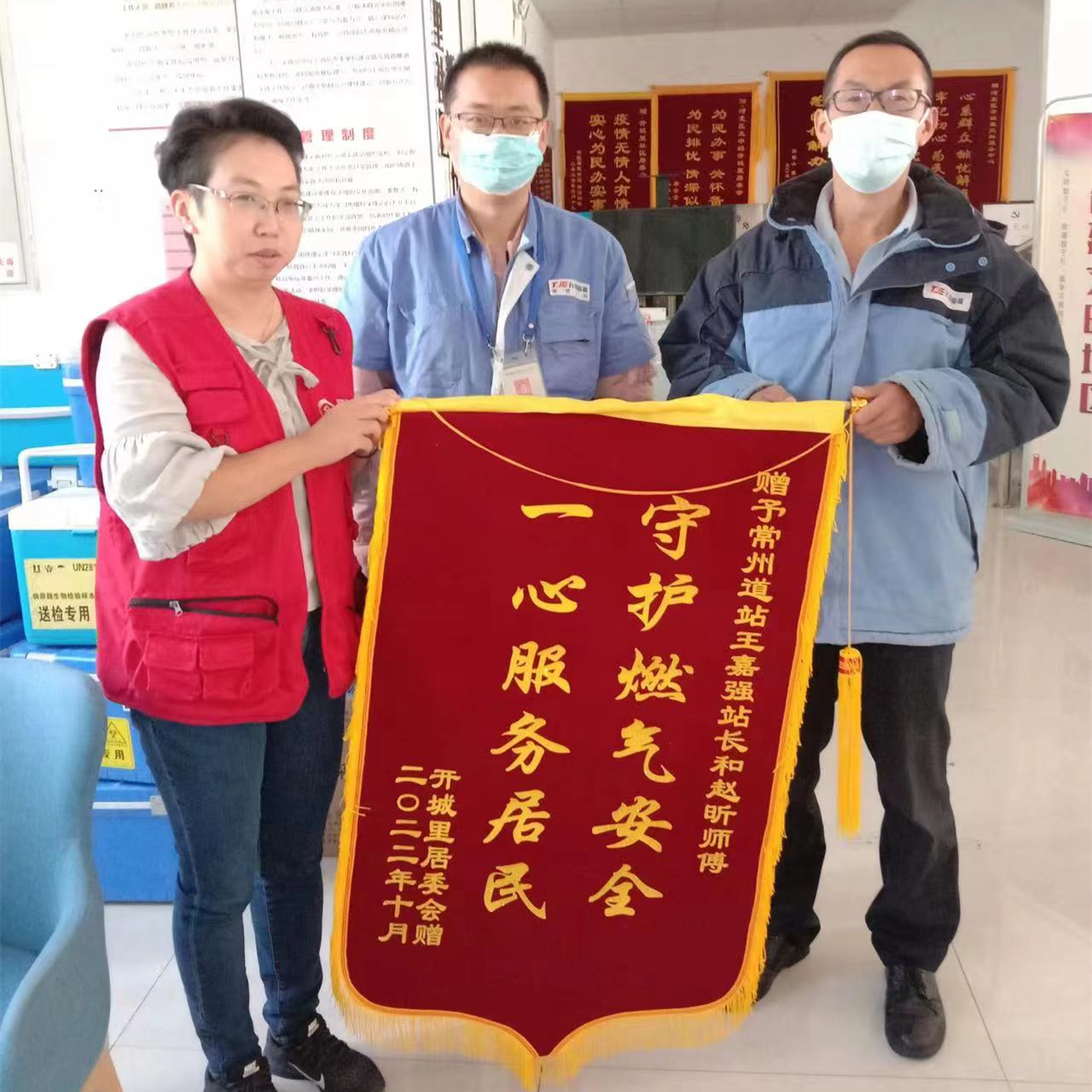 近日,河?xùn)|區(qū)常州道開(kāi)城里居委會(huì)郭主任將一面寫(xiě)有“守護(hù)燃?xì)獍踩恍姆?wù)居民”的錦旗送到一分公司城東營(yíng)業(yè)所常州道服務(wù)站站長(zhǎng)王嘉強(qiáng)手中,對(duì)所內(nèi)工作人員有力推進(jìn)小區(qū)戶內(nèi)燃?xì)怆[患整治工作表示感謝。