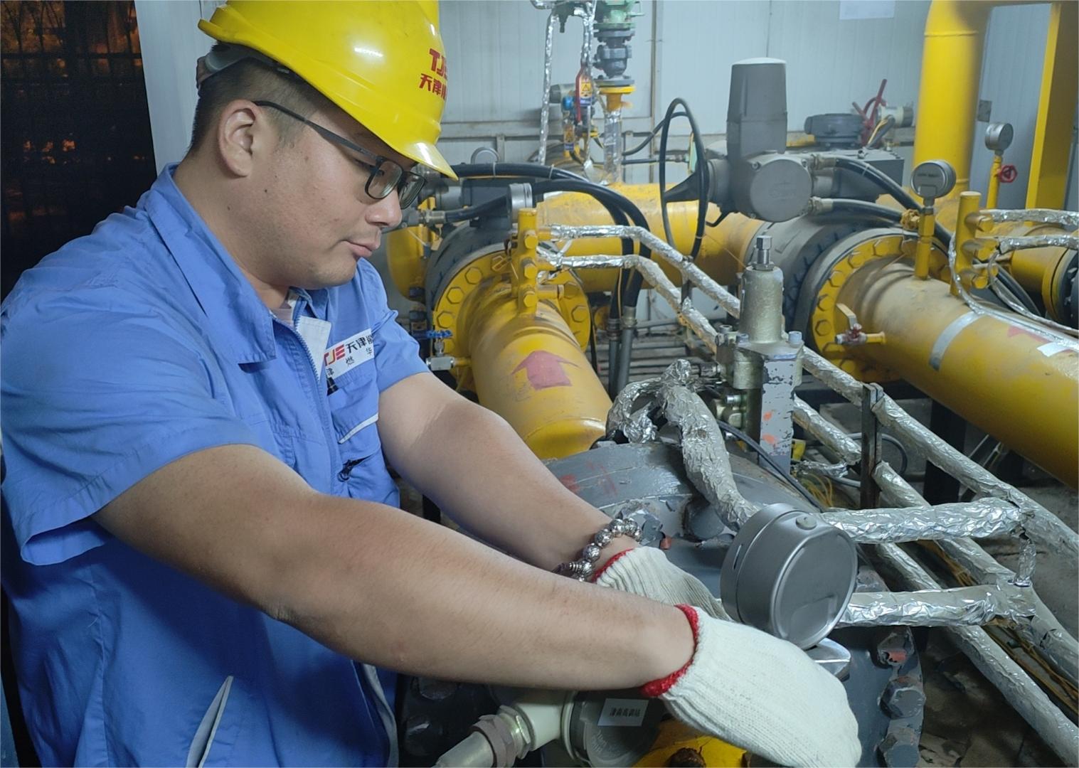 津燃華潤公司所屬濱海燃氣集團泰華燃氣公司運行門站運行工郝卓利在工藝區(qū)進行檢查