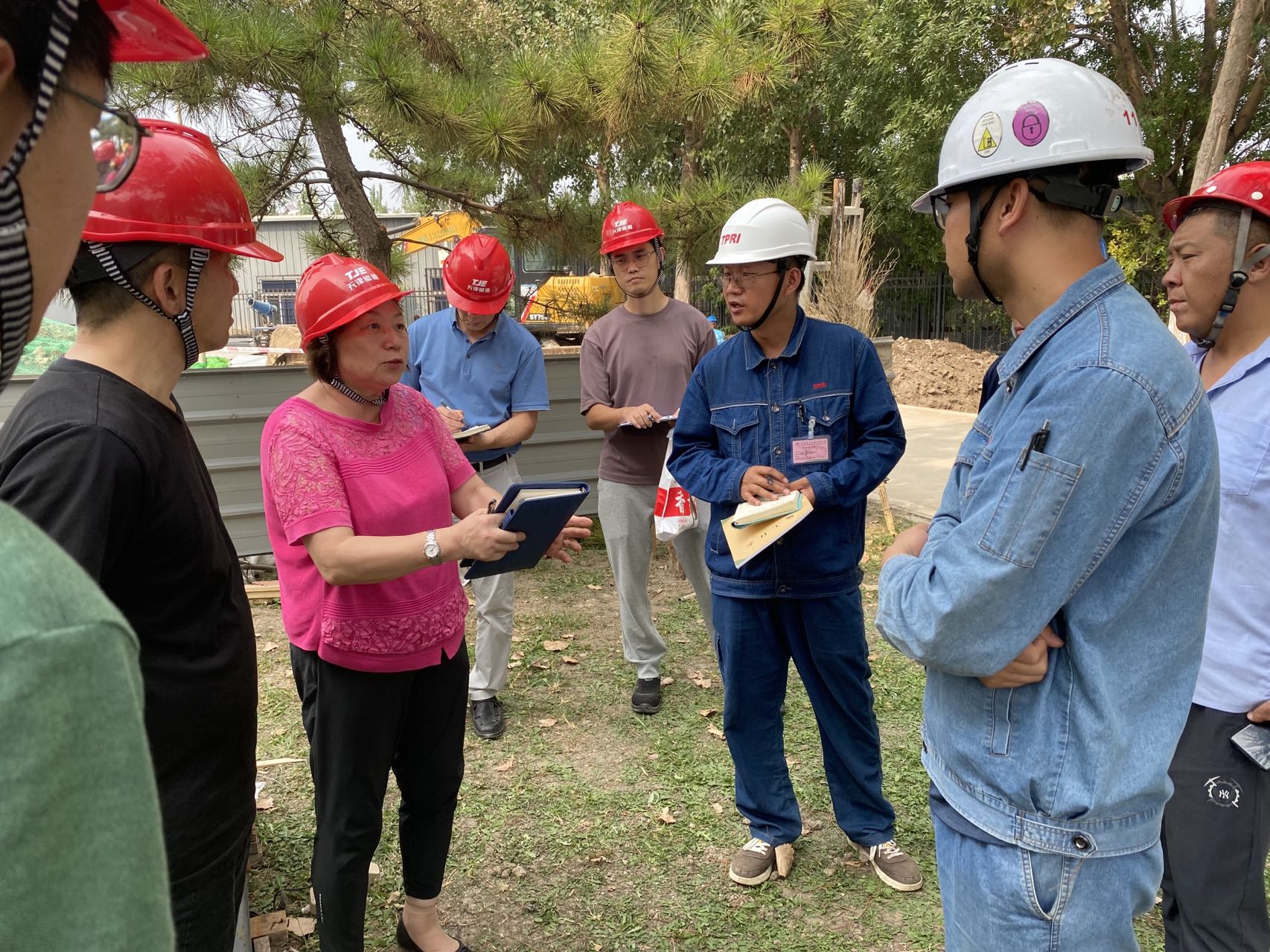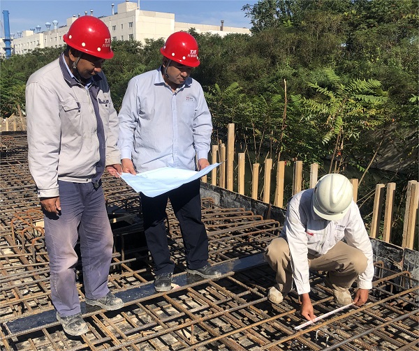 城安熱電公司工程管理部工程管理員章拓(左一)、余心明(左二)、劉超(左五)在泰達生活垃圾焚燒電廠綠色零碳熱源開發(fā)項目現(xiàn)場會同相關(guān)施工單位開展安全檢查