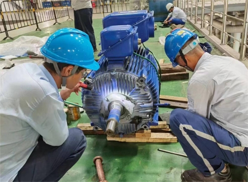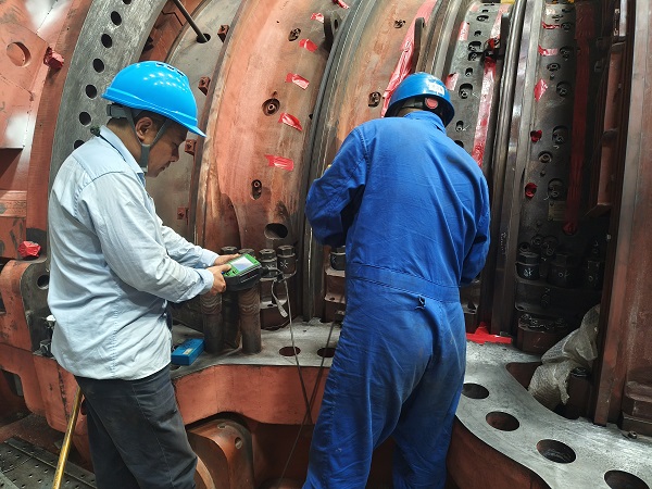 陳塘熱電公司檢修部電氣點檢趙常偉(左)驗收#5燃機盤車電機,確保機組檢修圓滿完成