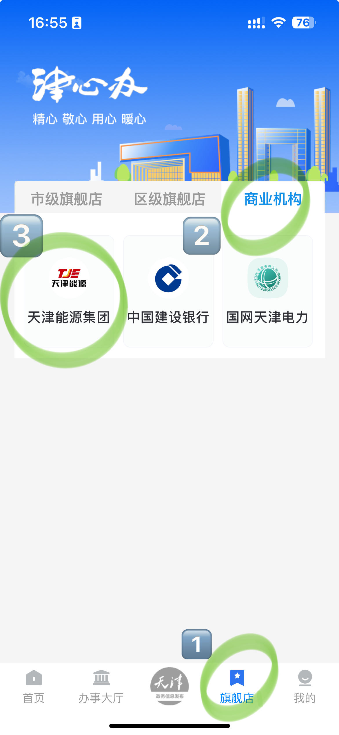 | 第2步:依次點(diǎn)擊【旗艦店】-【商業(yè)機(jī)構(gòu)】-【天津能源集團(tuán)】,進(jìn)入首頁(yè) | 第2步:點(diǎn)擊【服務(wù)大廳】,進(jìn)入首頁(yè) | 第2步:進(jìn)入小程序首頁(yè) |