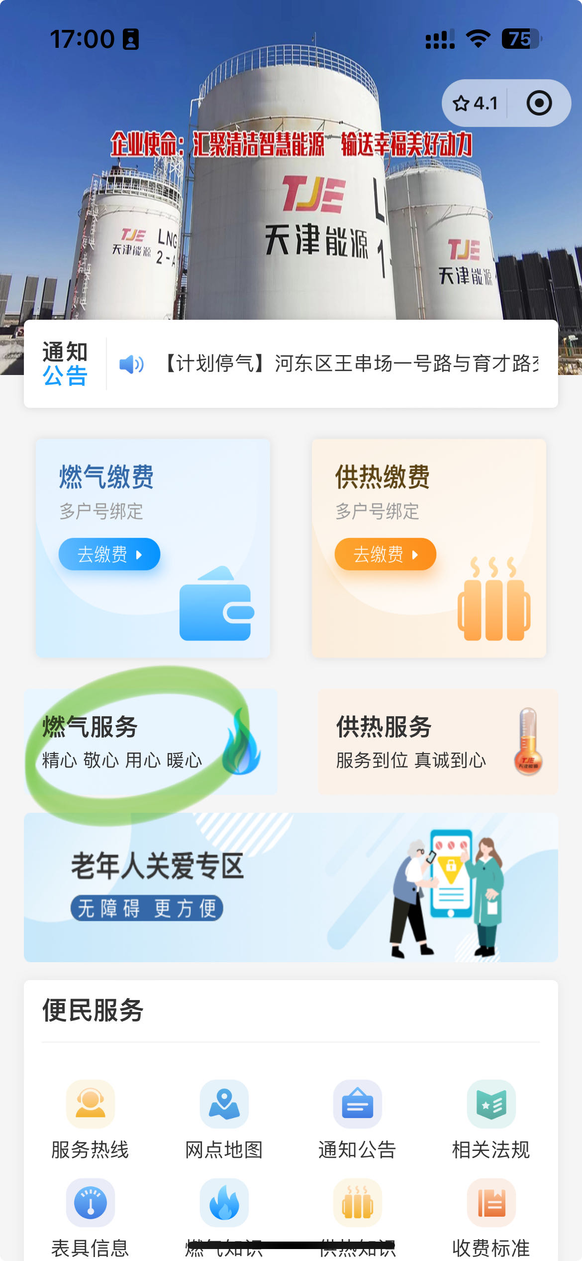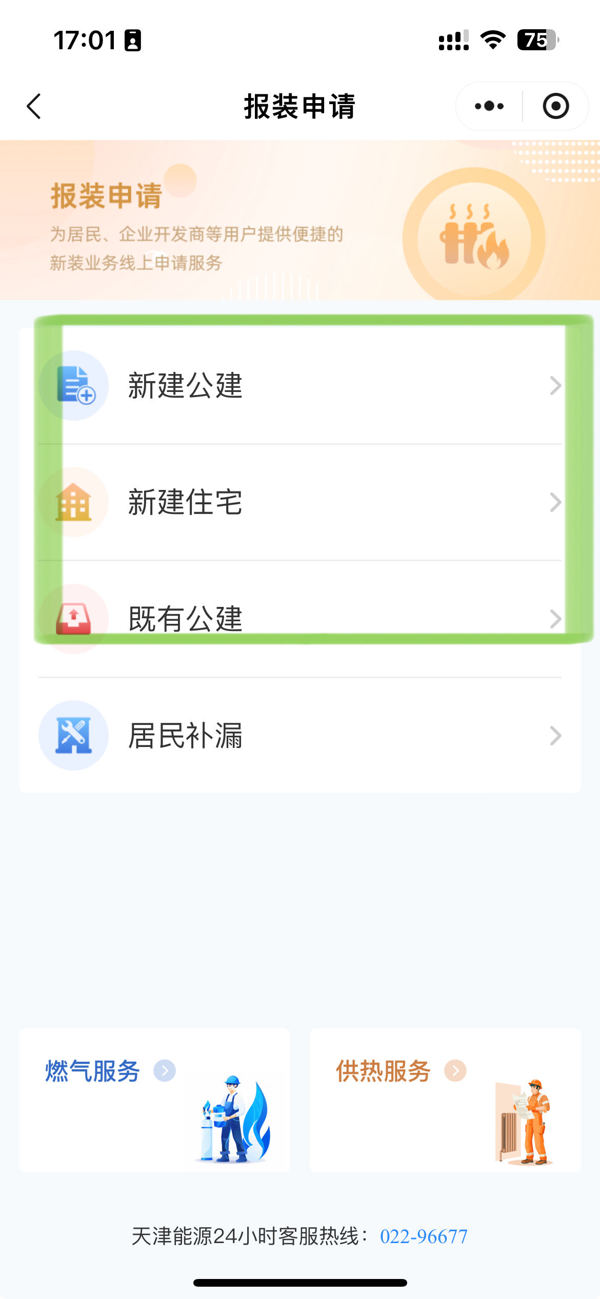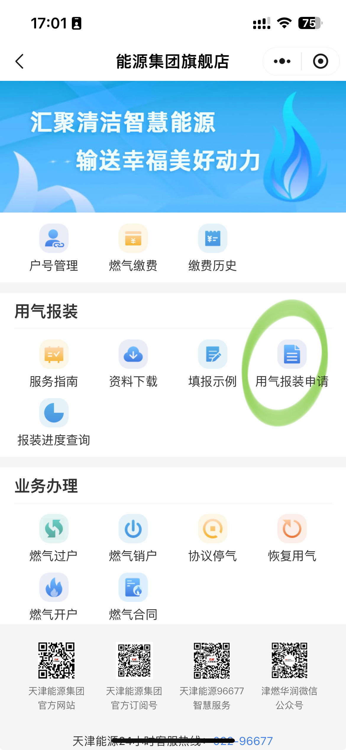 用氣報(bào)裝涉及填報(bào)內(nèi)容較多,請(qǐng)通過“津心辦”天津能源集團(tuán)旗艦店、天津能源96677智慧服務(wù)微信小程序等移動(dòng)端進(jìn)行申請(qǐng),操作步驟如下: