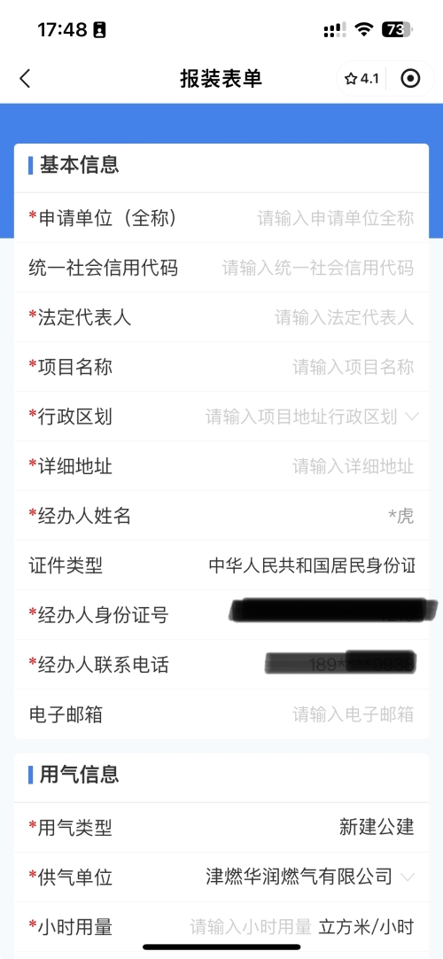 | 第4步:填寫報(bào)裝項(xiàng)目基本信息和用氣信息等,確認(rèn)無(wú)誤后提交即可。 |