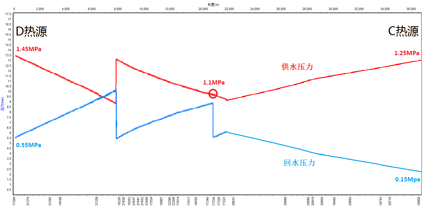 首先利用多熱源聯(lián)網(wǎng)模擬仿真系統(tǒng)對4座熱電聯(lián)產(chǎn)熱源、9座調(diào)峰熱源、1座躉售調(diào)峰熱源、6座地熱熱源聯(lián)網(wǎng)調(diào)峰系統(tǒng)進行水力計算。通過計算得知,D電廠二級中級泵站后部管網(wǎng)整體壓力較低,若將泵站后管網(wǎng)與其他供熱管網(wǎng)聯(lián)網(wǎng),將造成該區(qū)域管網(wǎng)整體壓力上升,同時其他供熱管網(wǎng)壓力下降,不利于管網(wǎng)的整體安全穩(wěn)定運行。C熱源與D熱源在二級中繼泵站后聯(lián)網(wǎng)水壓圖如圖2所示,此時C熱源供/回水壓力下降至1.25 MPa/0.15 MPa,回水壓力低于熱網(wǎng)循環(huán)泵氣蝕余量,D熱源供/回水壓力上升至1.45 MPa/0.55 MPa,且D電廠二級泵站供水壓力上升至1.1 MPa,造成D熱源管網(wǎng)整體壓力較高,此時壓力無法滿足運行需求。鑒于以上原因,利用D電廠二級中繼泵站入口位置的連接管道,將D電廠與C電廠聯(lián)網(wǎng)點位由中繼泵站出口切換至中繼泵站入口,實現(xiàn)C電廠管網(wǎng)不經(jīng)過二級中繼泵站加壓,從而使兩個管網(wǎng)在該位置的壓力能夠平衡,使管網(wǎng)整體運行穩(wěn)定。