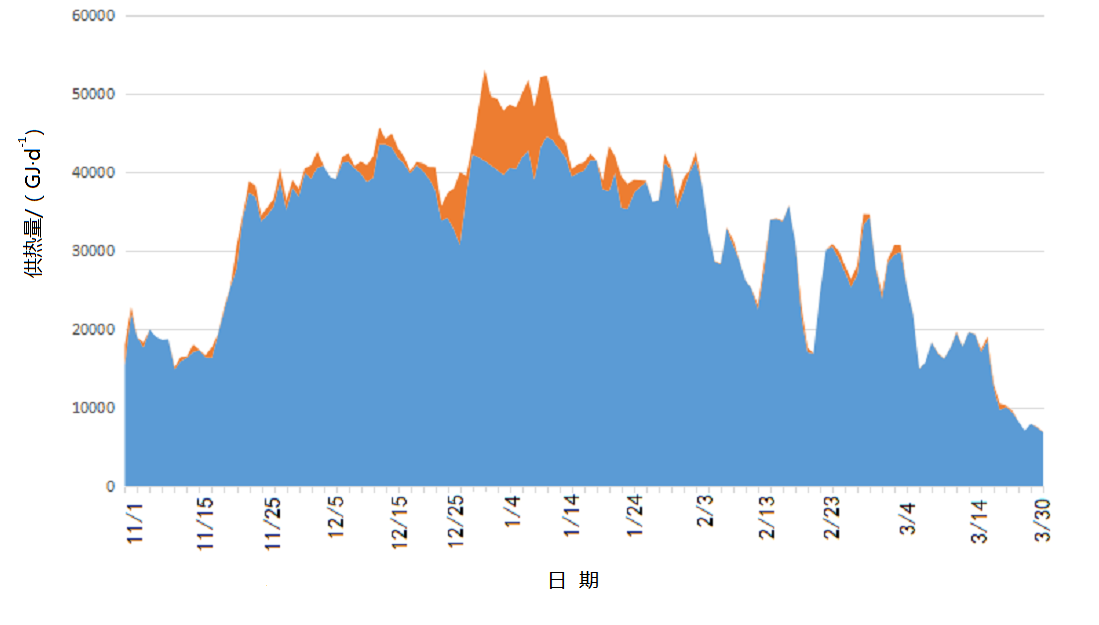 D熱源與F調(diào)峰熱源熱量疊加圖如圖5所示。由圖可以看出,F調(diào)峰熱源僅在鍋爐測試、深冷期和D熱源故障過程中啟動運行,其它大部分時間保持停運或低負荷運行狀態(tài),提升了系統(tǒng)運行的經(jīng)濟性。