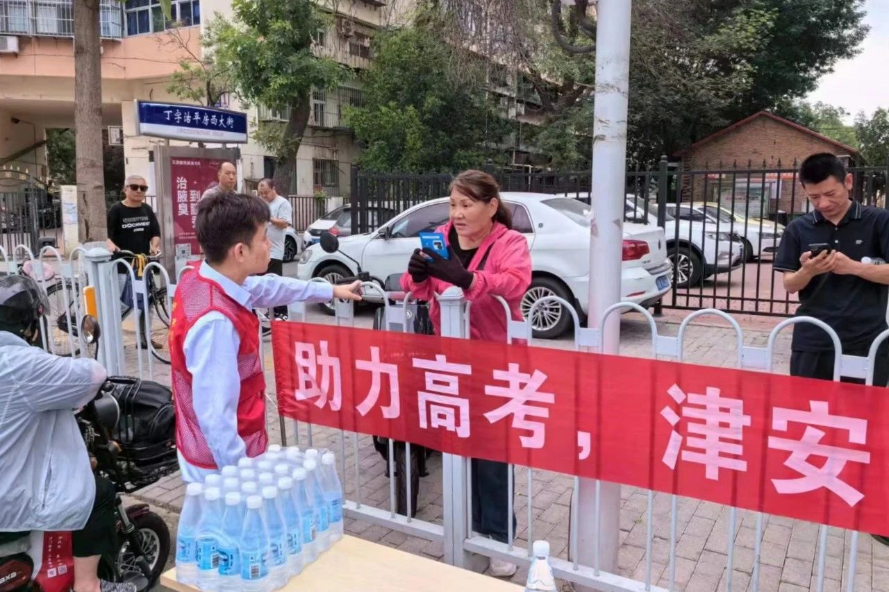 志愿者們精心策劃活動(dòng)方案,在總結(jié)往年經(jīng)驗(yàn)的基礎(chǔ)上,進(jìn)一步細(xì)化工作任務(wù),明確現(xiàn)場(chǎng)注意事項(xiàng),全力為考生及家長(zhǎng)提供更優(yōu)質(zhì)的服務(wù)保障。在天津市第四十一中學(xué)、第二南開(kāi)中學(xué)、第三中學(xué)、第一百中學(xué)、民族中學(xué)考點(diǎn)前,志愿者們身穿統(tǒng)一服裝、佩戴志愿者標(biāo)志早早來(lái)到考場(chǎng)門(mén)口,設(shè)置愛(ài)心助考“加油站”,搭建家長(zhǎng)遮陽(yáng)等候區(qū),準(zhǔn)備筆、橡皮、文件袋等文具,擺放礦泉水、藿香正氣水、扇子等助考物資,面帶微笑地迎接著每一位考生。他們協(xié)助交警指揮交通,維持考場(chǎng)交通秩序;規(guī)范擺放共享單車(chē),清理考場(chǎng)周?chē)?/p>