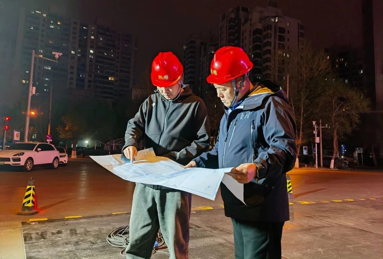 23:00,當整座城市逐漸進入夢鄉(xiāng),和平區(qū)貴陽路與營口道現(xiàn)場卻是一幅燈火如晝、熱火朝天的景象,溝槽探挖、接口焊接等施工工序有條不紊地推進。溝槽旁,現(xiàn)場管理人員身著藍色工服,頭戴安全帽,不時俯身仔細查看坑底管網(wǎng)走向,“夜間施工窗口期短,我們必須分秒必爭!”工程管理部負責人王新緊盯施工節(jié)點,指揮若定。在圍擋之外,大家同樣沒有絲毫懈怠,交通協(xié)管專員落實好每一個路口的交通引導(dǎo),力求將施工對周邊交通的影響降到最低。