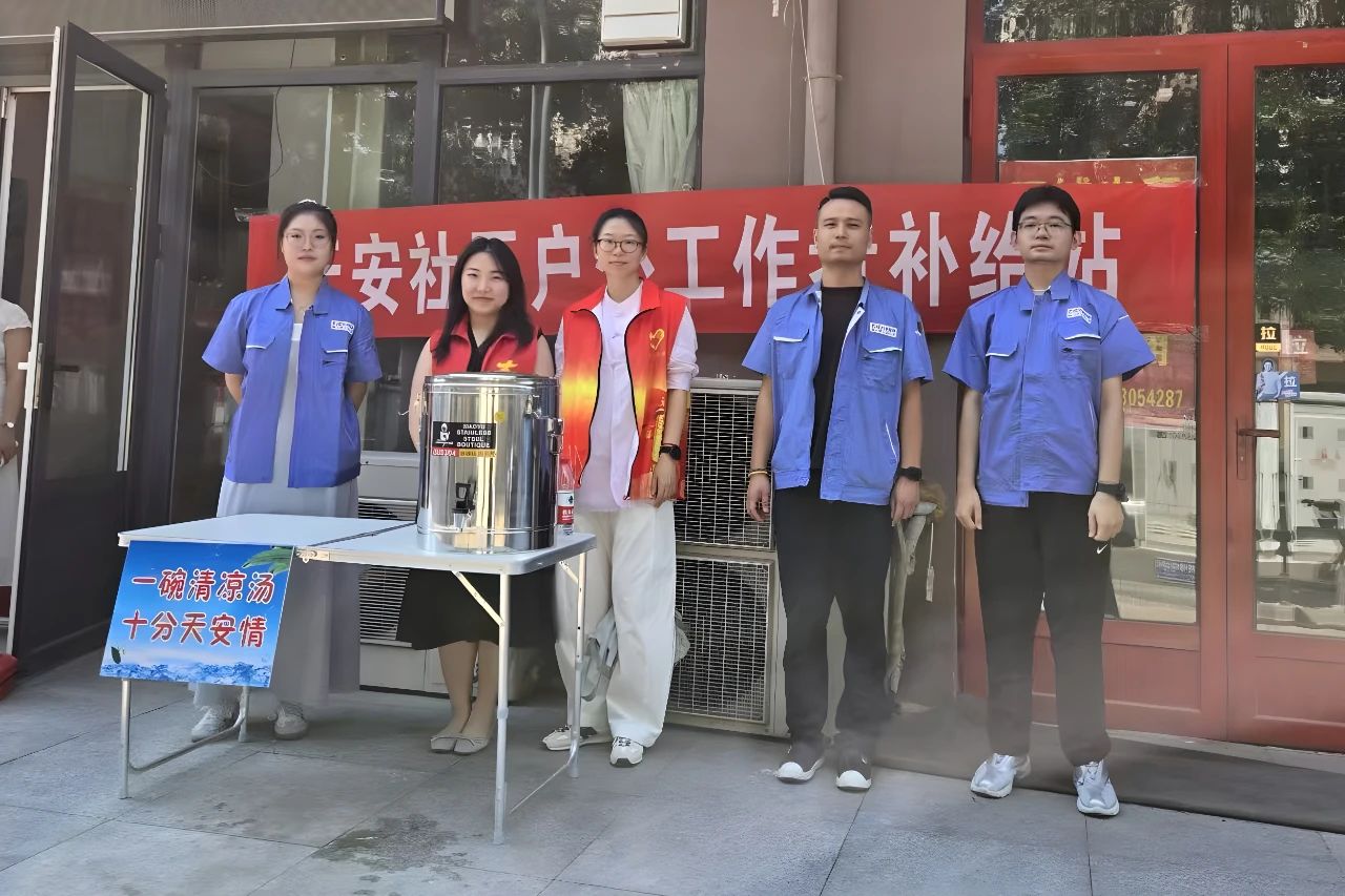 活動結(jié)束后,公司黨員、團員們迅速行動,推著裝滿冰鎮(zhèn)綠豆湯的保溫桶來到小區(qū)門口,以實際行動為“蒸”戰(zhàn)一線的“城市守護者”們送去一份清涼慰藉。